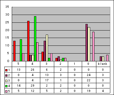 自由記述:(記述有の回答を全て掲載) ===== A.この授業で良かったと思う点があれば書いてください。 B.この授業で問題があると思う点があれば書いてください。 C.この授業に対するその他の意見・感想・提案があれば書いてください。 ===== A.宿題がためになった。 B.提出期限が早い気もするがこんんあもんんかと思った。 C.よかった。 A.隔週のレポート。板書。 B.レポートの評価。 先週に出したレポートの評価が不明。 人のを写しただけの人の評価が上がり相対的に自分で解いた人の評価が下がる。 授業の始まりが遅く感じる。 C. A. B.2週目で出した課題を1週でやるという型だったが、1週目で出したのを2週でやりたかった。 C. A.プログラムをいろいろ勉強できた。 今まで、ただC言語の書き方を覚えるため簡単なプログラムを書いた。 B.課題はちょっと難しい。 C. A.難しかったが、力になったと思う。 B.ノートを書く時間がもう少しあれば、解説をもっとよく聞けるはずだと思う。 プリントにして配布してもらえると助かる。 C. A.プログラム実習が課題で出されたこと。 よく考えさせられた。 B.できれば出した際すぐに「届きましたメール」が欲しかった。 C. A.プログラムの作り方によって時間とかにかなり影響があり、そういった意味でのプログラムの難しさを知ることができました。 B. C.プログラミングは苦手なので大変だったけどとてもためになった授業でした。 A.成績評価が明白。授業がわかりやすい。 B.課題が授業と比べると少し難しい。 C. A. B.余計な説明が多く、授業が冗長。 サンプルプログラムを丸々写すだけで課題ができるのは、課題としていかがか? 反面、サンプルプログラムの動作については講義中に説明されないので、プログラムのアルゴリズムがよくわからない。 C.もっと内容をふやして、説明を簡けつにしたほうが良いと思う。 A.課題で評価されるところ。 B.人に教えた回数で評価されるのは不公平だと思う。 C.授業中に景品とかどうかと思う。終わってからやって下さい。 A.いいかんじの頭の体操になると思った。 B.レポートのフィードバックが無い事。もし、間違っていてもわからない。 C. A.課題が隔週であったため、大きな負担になることはなかった。 内容も適切な難度であったと思う。 B.黒板で書くプログラムリストに省略部がところどころあり、課題において定義する時に困ったことがある。 C. A.課題は難しかったが真剣に考えた分実力がついたのが実感できる。 B. C. A.かめだ先生の口調。景品がイッちゃっているところ。 B.C言語っぽくない日本語の表記を折り混ぜてソースを黒板に書かれて困った。 びしっとソースを書いてほしい。 C.もっと良い景品を! A.テストがない。 ひとにプログラムを教えてもらっても良い所。 全くわからない私にとって、すごくよかったです。 B.特になし。 C.先生の説明がわかりやすい。(板書とか) A.聞きやすい話し方だった。 B. C. A.プログラムの書き方によっていろいろな結果となることがわかった。 (計算量がまったく違うようになるので比例して時間がかかる。) B.特になし。 C.特になし。 A.毎週課題が出るので実践できる点。 ホームページに課題が載ってる点。 B.6時間ぐらい実行に時間のかかる"Knight's Tour"の課題は非常に時間がかかるので、問題があった。 C. A.先生に質問に行っても快よく答えてくれたこと。 B.提出期限が短かったこと。 C.プログラムが好きになった。 A.プログラミングの技術が向上した。 B.自分の不勉強もあるが、後半授業についていけず、理解できないことがよくあった。C.
